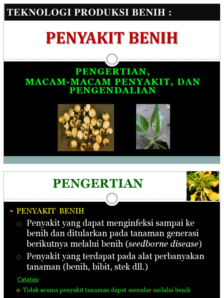 Penyakit benih merupakan penyakit penting pada berbagai komoditas pertanian. Penyakit benih ini dapat menyebabkan kerusakan dalam bentuk perubahan warna, bentuk, nekrose, penurunan daya kecambah, dan mengurangi nilai biji (benih). Kehilangan hasil yang disebabkan penyakit benih mencapai lebih dari 5 %, dan infeksinya dapat mencapai 50%.